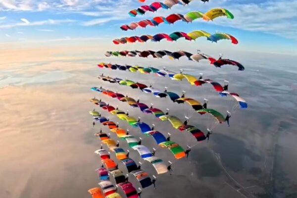 Um grupo de atletas de 20 países conectou paraquedas abertos em uma formação gigante na modalidade Canopy Relative Work (CRW).