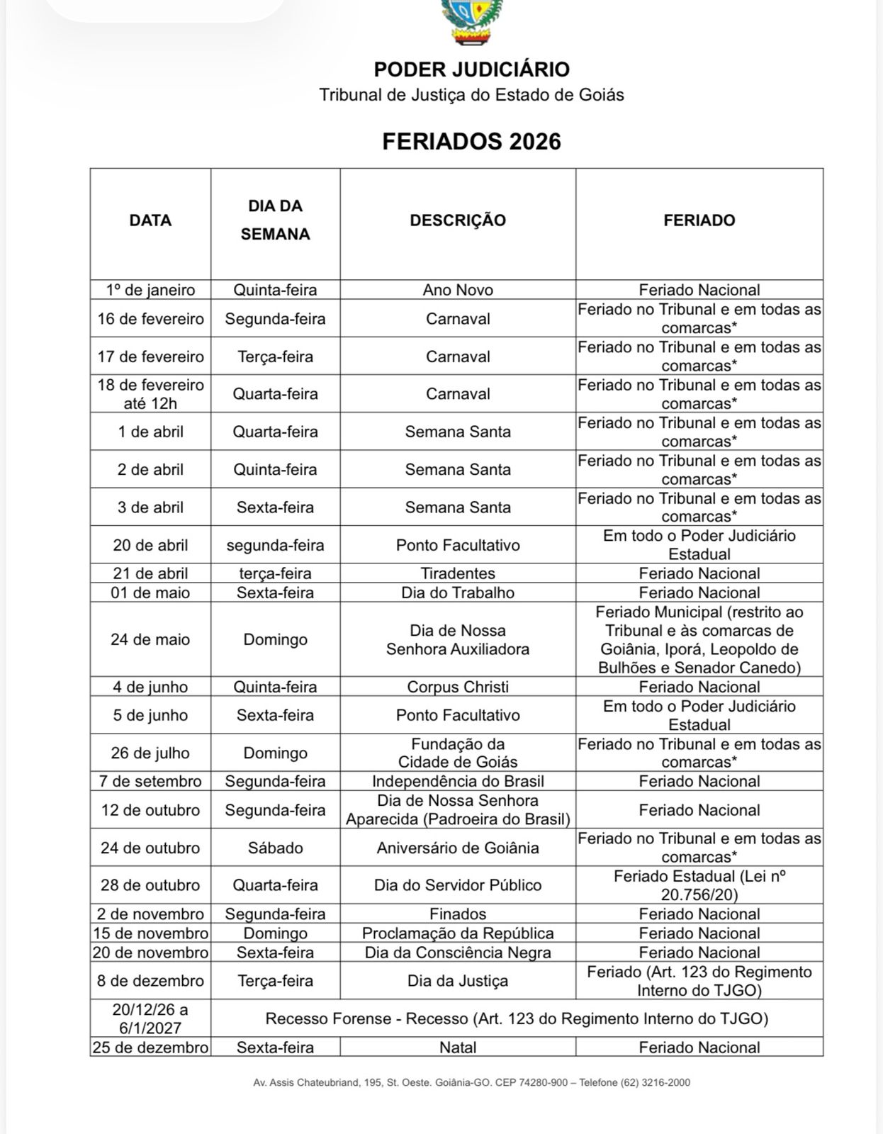 O Tribunal de Justiça do Estado de Goiás (TJGO) divulgou o calendário oficial de feriados e pontos facultativos de 2026 no âmbito do Poder Judiciário estadual, com destaque para o recesso forense entre 20 de dezembro de 2026 e 6 de janeiro de 2027, além de datas internas previstas no Regimento e no Código de Organização Judiciária.